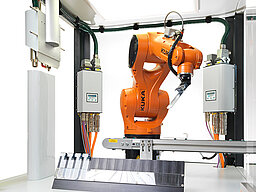 Beneath single system with generator, PCU and plasma nozzle Plasmatreat offers for its customer for test and trial as well as fully equipped PTUs (Plasma Treatment Units). These units can be used for efficient, uncomplicated pretreatment for almost any process. Small, medium and large multi-axis robots within the production cell can be used to transport the components or to move the plasma nozzle around a static assembly. The parts feeding can also be realized optionally via an integrated conveyor belt or a turntable.