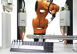 The turnkey, fully automated PTU1212 plasma cell was developed by Plasmatreat to enable the shop floor implementation of Plasma-SealTight® technology. The cell, which can be adapted to suit any conventional injection molding machine, enables the very rapid and environmentally friendly inline pretreatment of mass-produced plastic-metal components.